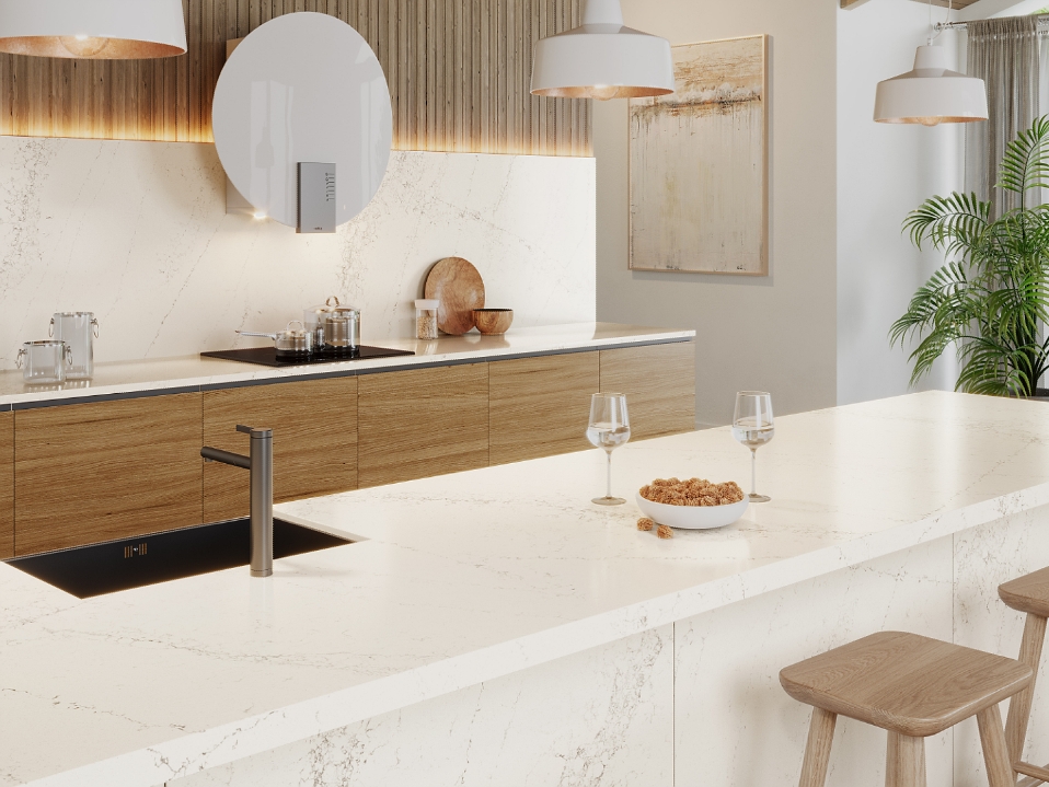 As Caesarstone’s interpretation of natural Calacatta marble, Calacatta Nuvo brings you wide, elegant, cascading, grey veins on a white base.